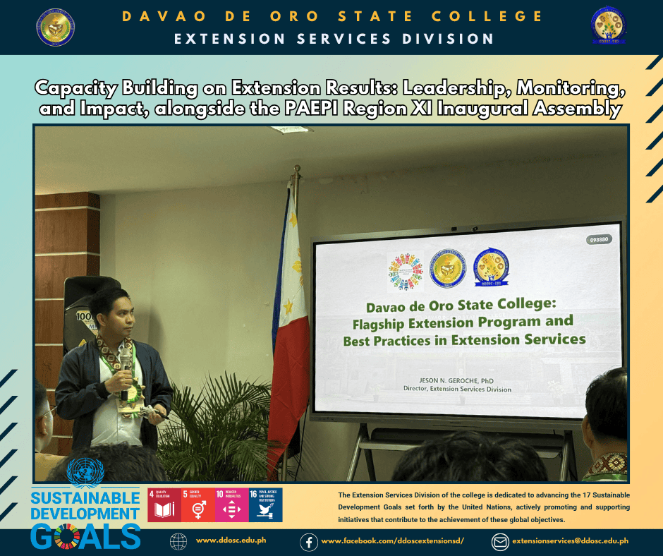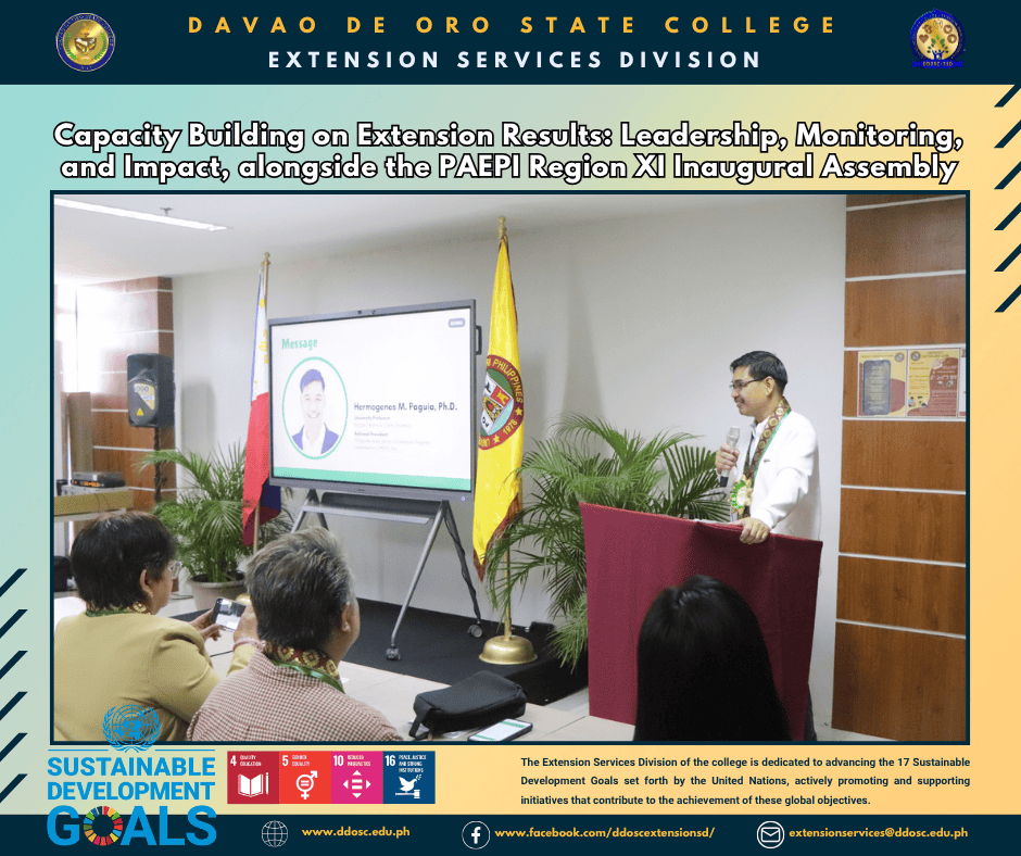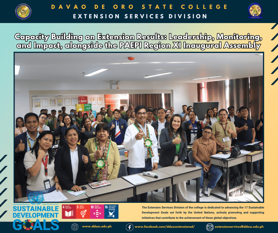 Upholding monitoring and evaluation as key drivers of accountability across every extension initiative, the Davao de Oro State College, through its Monitoring and Evaluation (M&E) Committee of the Extension Services Division (ESD), participated in the Philippine Association of Extension Program Implementers (PAEPI) Region XI Capacity Building on Extension Results: Leadership, Monitoring, and Impact and Inaugural Assembly held on Friday, October 3, 2025, at the University of Southeastern Philippines (USeP), Davao City.
