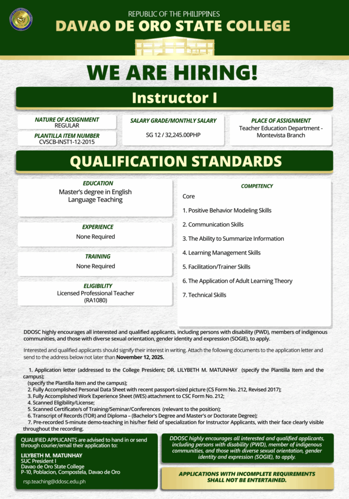 Posted on November 3, 2025 Davao de Oro State College announces the opening for one (1) Instructor I position, to be assigned at the DDOSC Montevista Branch.