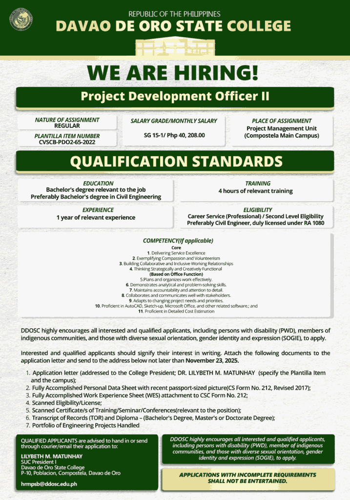 Posted on November 11, 2025 Davao de Oro State College announces the opening for one (1) Project Development Officer II position, to be assigned at the DDOSC Main Campus.