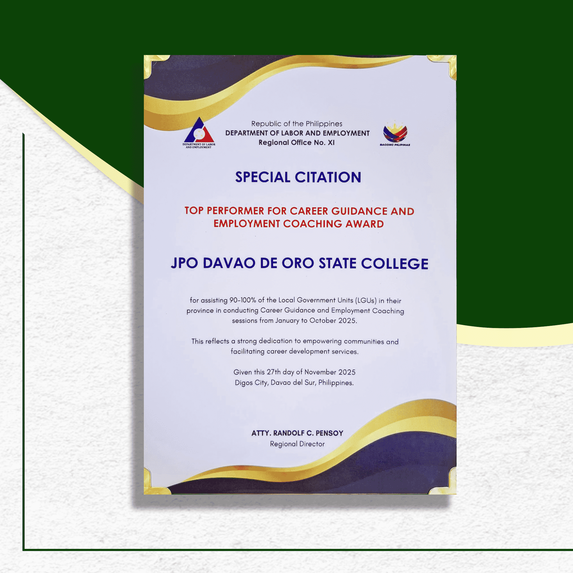 In recognition of the institution’s efforts to facilitate job opportunities for its alumni and the local communities, the Department of Labor and Employment Regional Office XI, in coordination with the Public Employment Services Office Managers Association of the Philippines (PESOMAP), awarded Davao de Oro State College for its Job Placement efforts during the 3rd Regional PESO Congress on November 27–28, 2025, at Big 8 Hotel, Digos City, Davao del Sur.