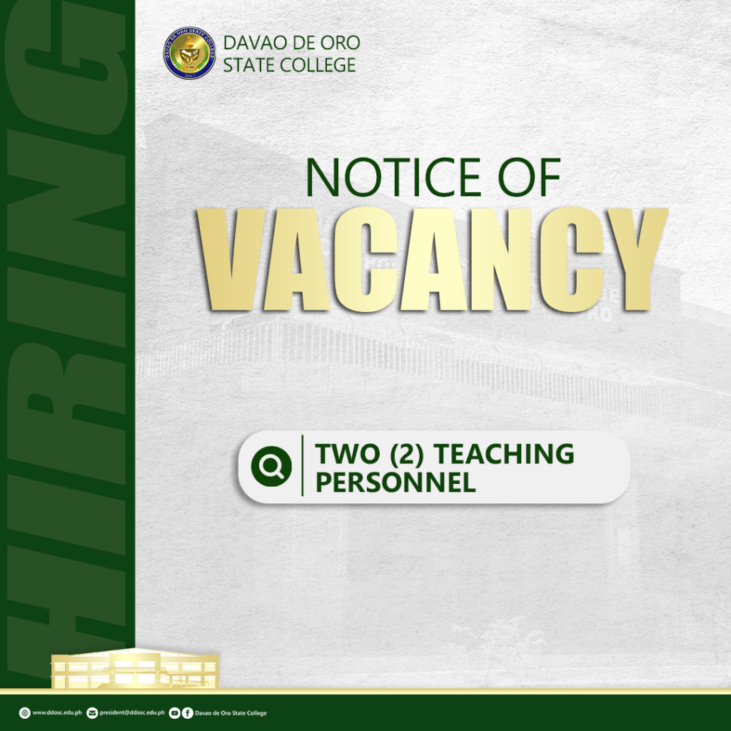 Posted on August 26, 2025 Davao de Oro State College announces the opening for one (1) Administrative Aide VI position, to be assigned at DDOSC Montevista.