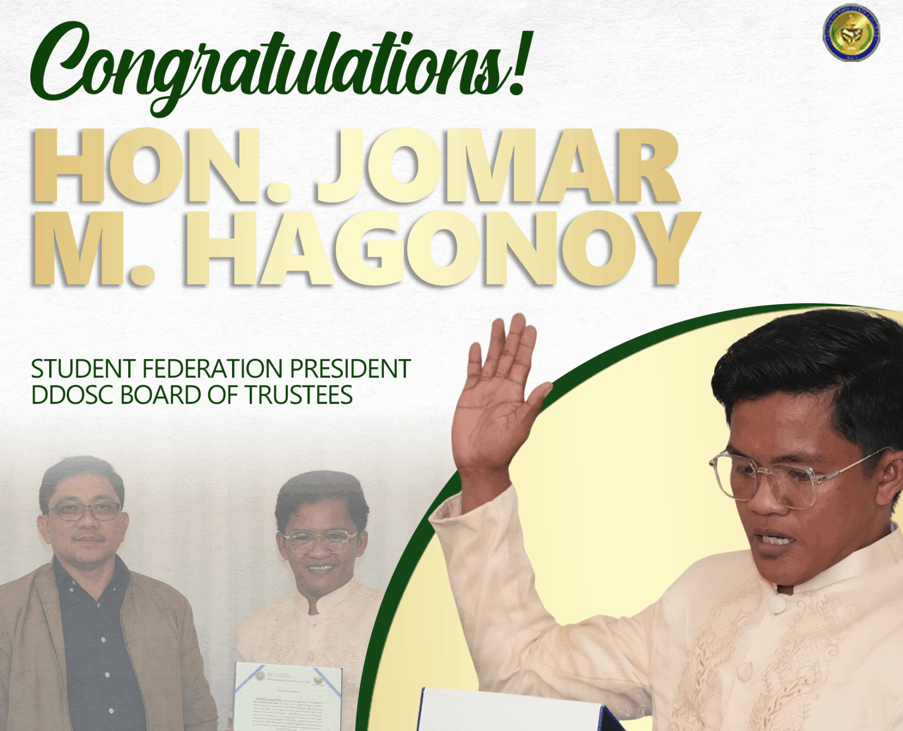 Hon. Desiderio R. Apag III, D.Eng., PCPE, Commissioner of the Commission on Higher Education and the Chairperson of the Davao de Oro State College Board of Trustees, administered the oath-taking of the newly appointed DDOSC Student Federation President Hon. Jomar M. Hagonoy on July 18, 2025. Hon. Desiderio R. Apag III, D.Eng., PCPE, Commissioner of continue reading : Hagonoy Takes Oath as New Student Federation President