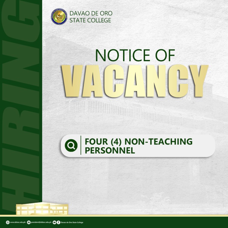 Davao de Oro State College announces the opening for four (4) non-teaching positions to be assigned at the DDOSC Main Campus.