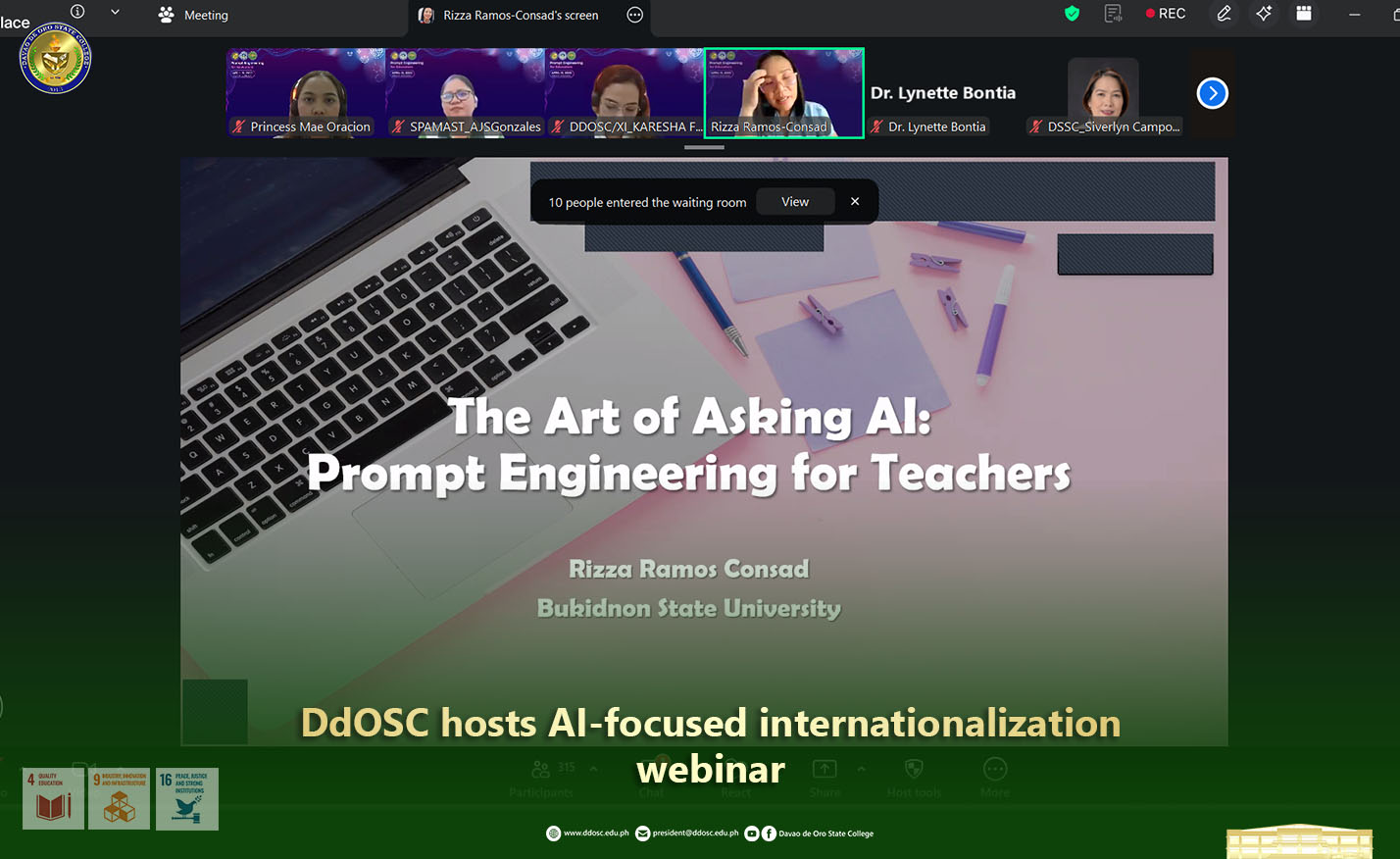 Davao de Oro State College strengthened its push for global academic alignment in the age of Artificial Intelligence (AI) by hosting the webinar dubbed “Prompt Engineering for Educators” today, April 15, 2026, via Zoom Teleconference. Davao de Oro State College strengthened its push for global academic alignment in the age of Artificial Intelligence (AI) by continue reading : DdOSC hosts AI-focused internationalization webinar