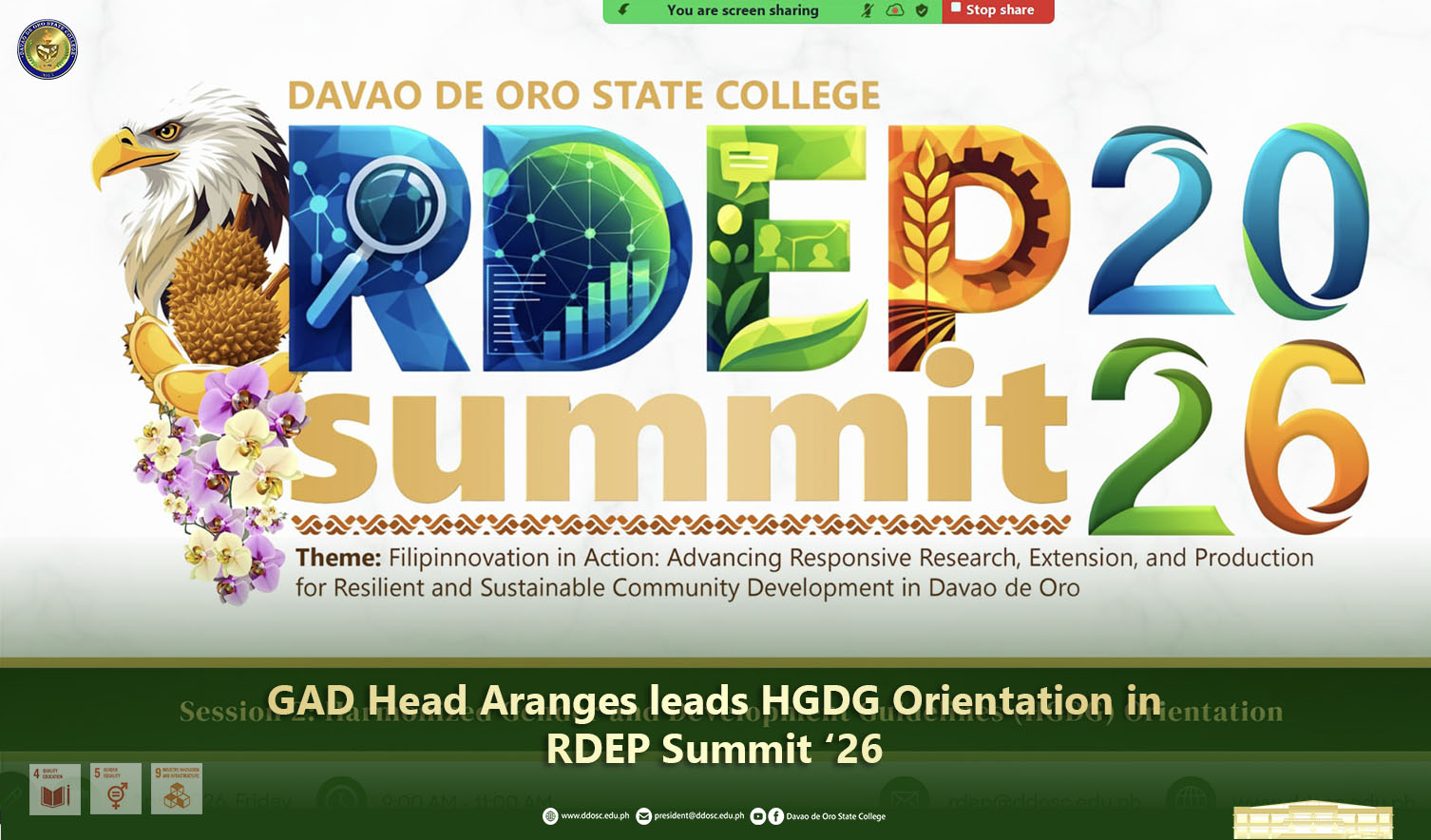 Gender and Development (GAD) Unit Head Sarah C. Aranges, MM, led the Harmonized Gender and Development Guidelines (HGDG) Orientation as part of the Research and Development, Extension, and Production (RDEP) Summit 2026 earlier today via Zoom. Gender and Development (GAD) Unit Head Sarah C. Aranges, MM, led the Harmonized Gender and Development Guidelines (HGDG) Orientation continue reading : GAD head Aranges leads HGDG Orientation in RDEP Summit ‘26