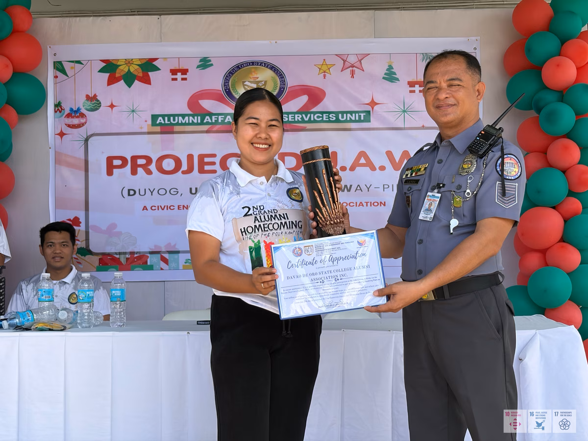 Davao de Oro State College, through its Alumni Affairs and Services Section and Alumni Association Inc., successfully spearheaded its first college-wide civic engagement initiative, PROJECT D.U.A.W. (Duyog, Uban, Amoma nga Way-pili), through a community outreach activity on December 29, 2025, at the Bureau of Jail Management and Penology (BJMP) Montevista District Jail, Montevista, Davao de Oro.