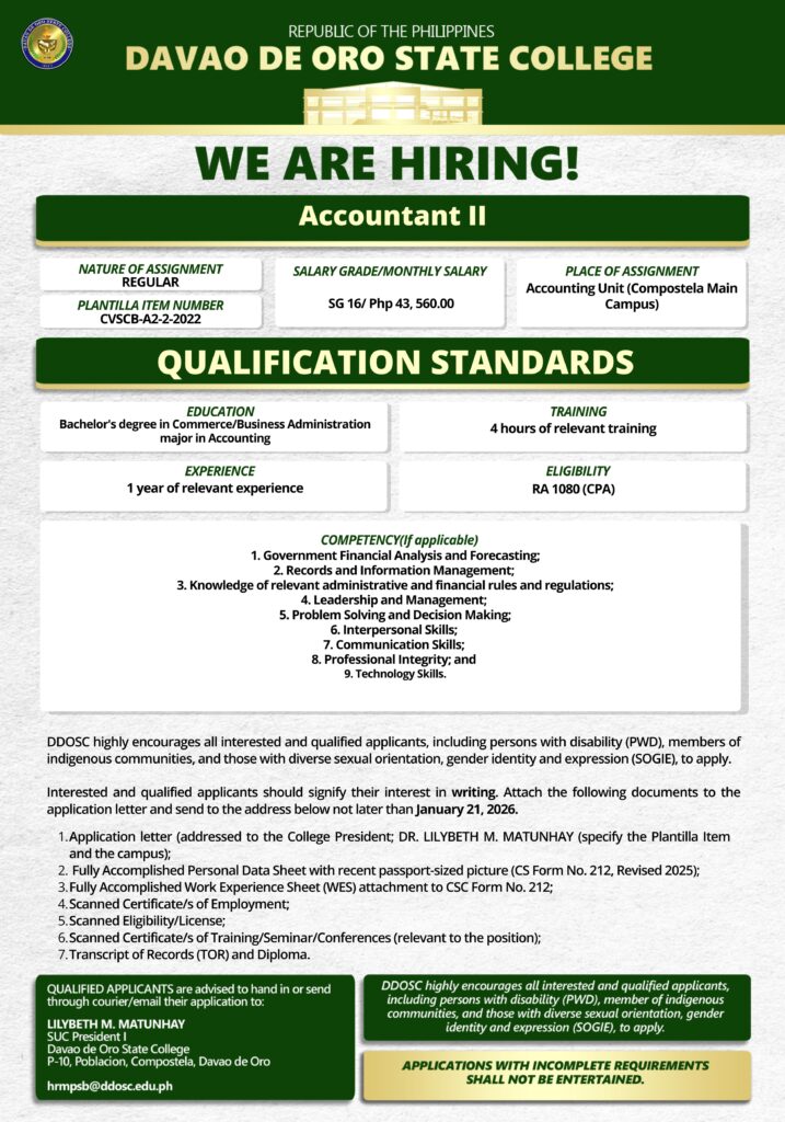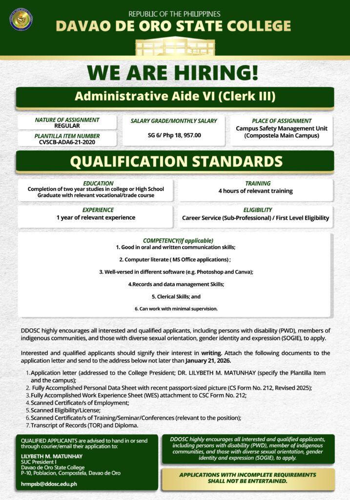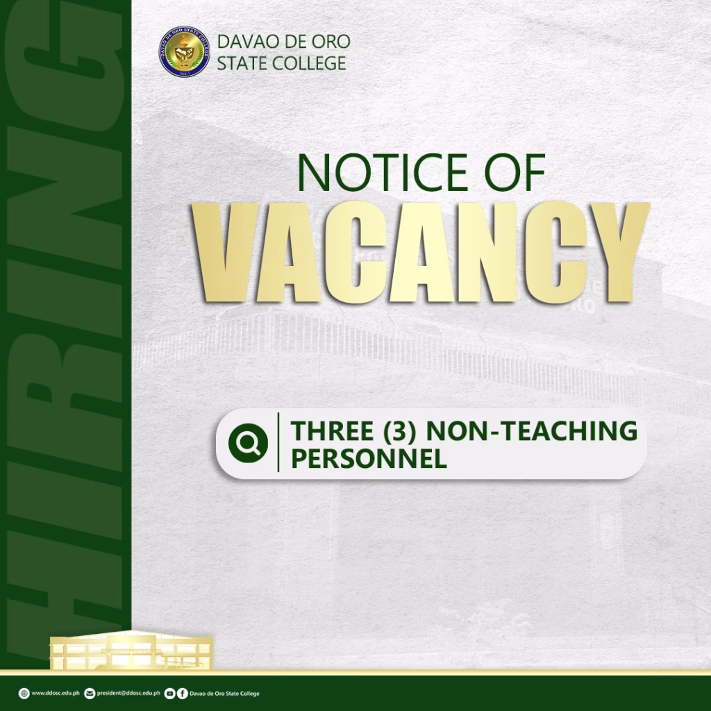 Posted on January 9, 2026 Davao de Oro State College announces the opening for four (4) non-teaching positions to be assigned at the DDOSC Main Campus.