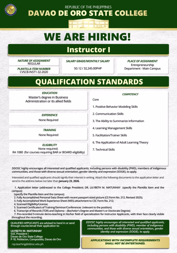Posted on January 13, 2026 Davao de Oro State College announces the opening for two (2) Instructor I positions, to be assigned at the DDOSC Main Campus and Maragusan Branch.