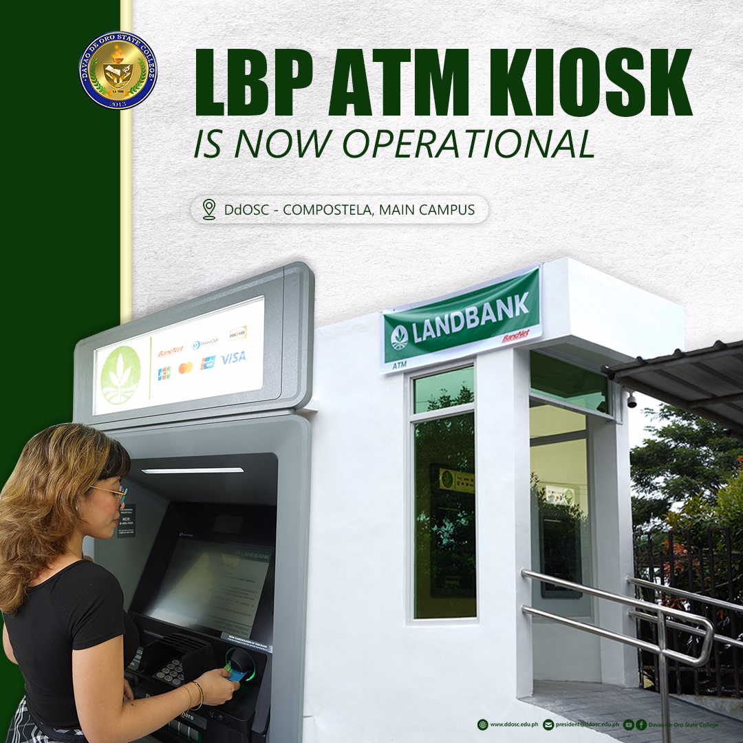 [ANNOUNCEMENT] Davao de Oro State College, in partnership with the Land Bank of the Philippines, is pleased to announce that the LBP Automated Teller Machine (ATM) Kiosk at the DdOSC Main Campus is now fully operational. The ATM kiosk is open to the public 24/7, providing convenient and accessible banking services to students, faculty, staff, continue reading : [ANNOUNCEMENT] Davao de Oro State College, in partnership with the Land Bank of the Philippines, is pleased to announce that the LBP Automated Teller Machine (ATM) Kiosk at the DdOSC Main Campus is now fully operational.