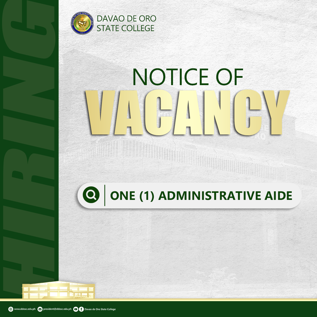 Davao de Oro State College announces the opening for one (1) Administrative Aide VI position, to be assigned at DDOSC Montevista.